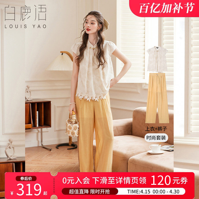 白鹿语 国风提花2件套女 2026夏新中式气质立领衬衫直筒长裤套装
