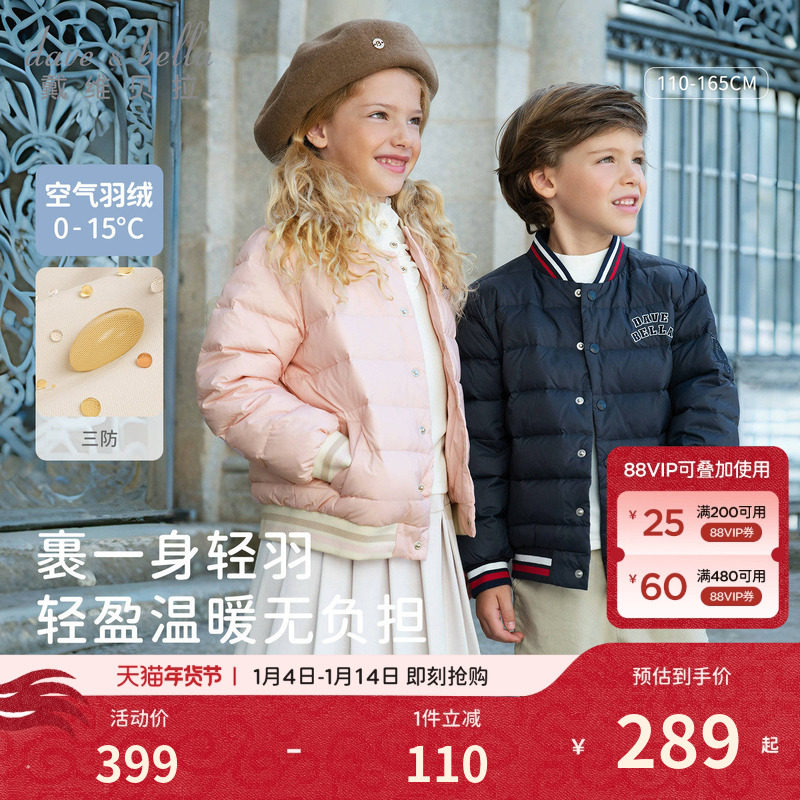 戴维贝拉儿童排骨羽绒服冬装新款男童女童三防棒球轻薄外套童装女