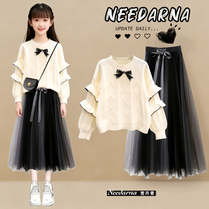 女童套装2025新红色蝴蝶结毛衣网纱裙女宝宝秋冬公主风洋气两件套