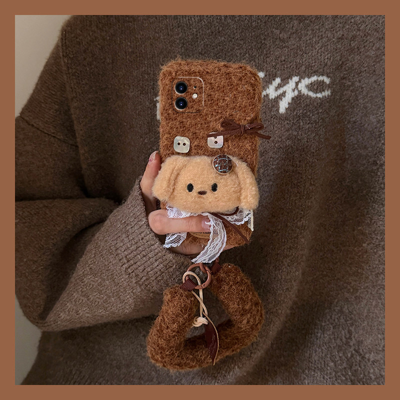 毛绒蕾丝小狗适用oppor17手机壳r15x带r11splus挂绳r11s卡通r9秋冬r9plus立体r7s毛茸茸r17pro绒布oppo冬天女