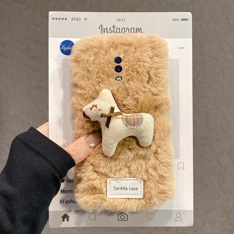 毛绒英文小马适用oppor17手机壳r15x卡通r11splus立体r11s带r9挂绳r9plus新年r7s秋冬r17pro毛茸茸oppo马年女
