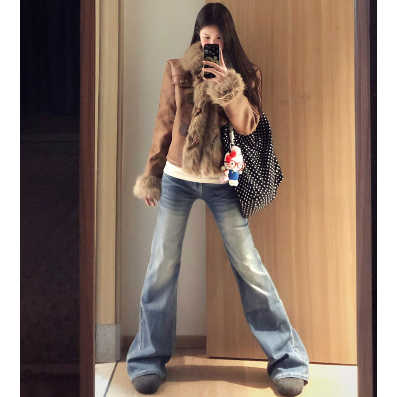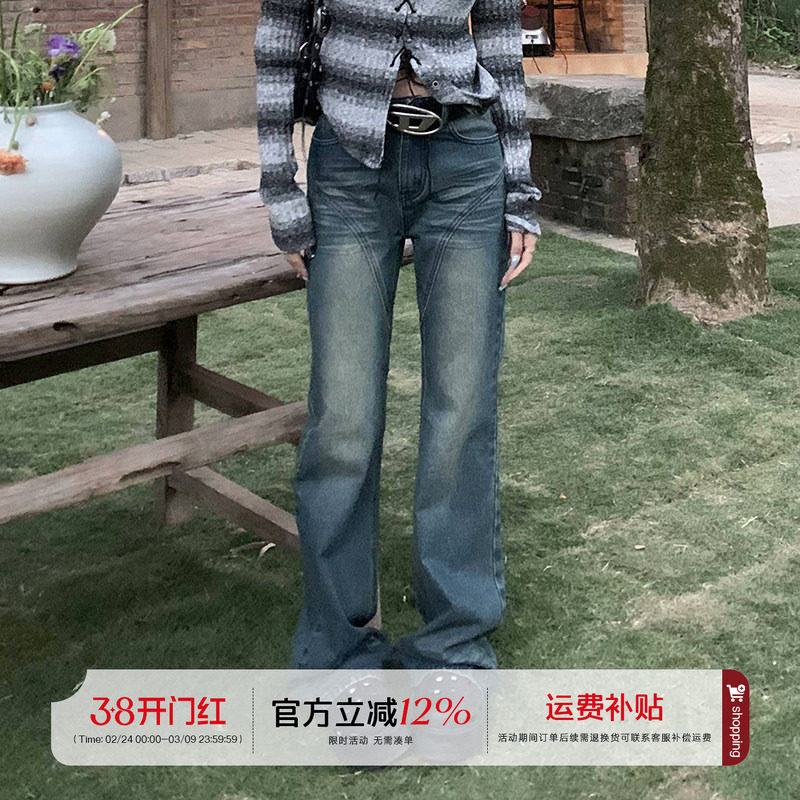 橘子树在哪儿复古做旧水洗低腰微喇牛仔裤女春季直筒显瘦拖地裤子
