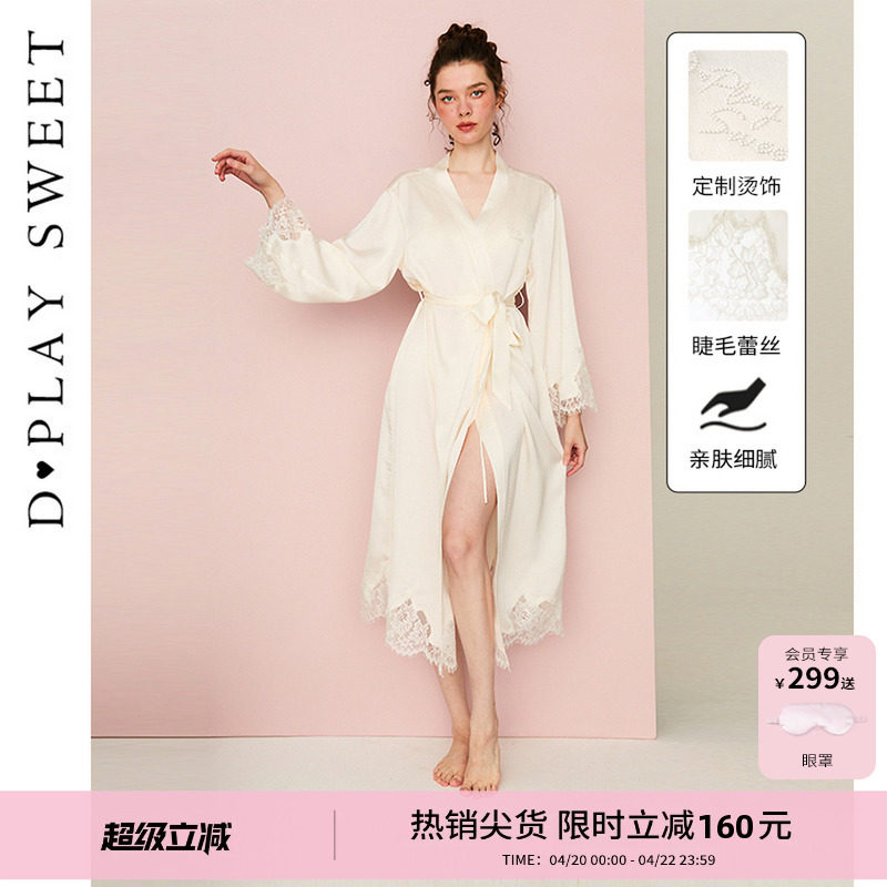 DPLAYSWEET法式性感缎面冰丝长袖睡袍睡衣女士蕾丝长款晨袍家居服