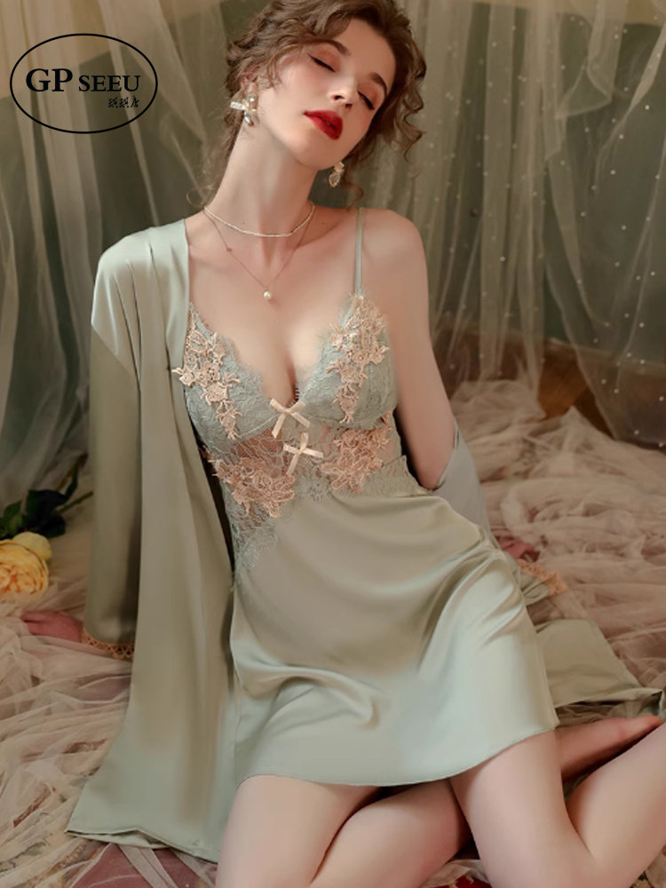 GP Seeu性感睡衣女春夏季新款真丝睡裙纯欲风带胸垫蕾丝吊带睡袍