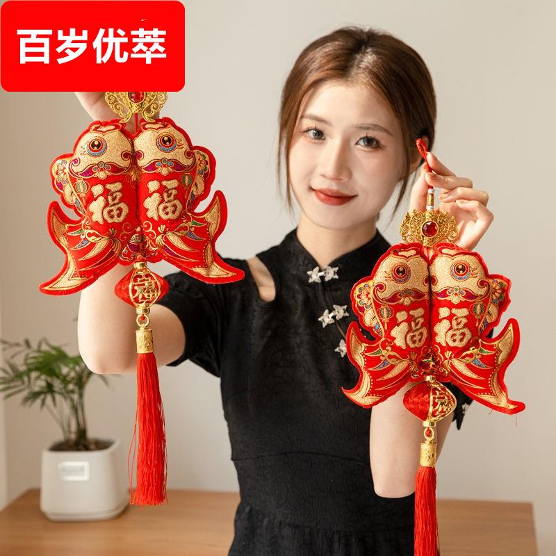新款对鱼双福植绒挂件流苏春节喜庆用品年年有鱼福气到家客厅挂饰