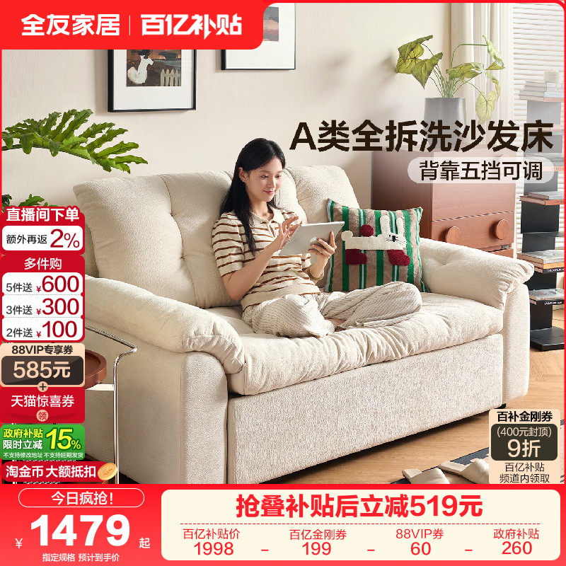 全友家居.奶油风沙发床折叠两用2025新款客厅卧室单人沙发可拆洗