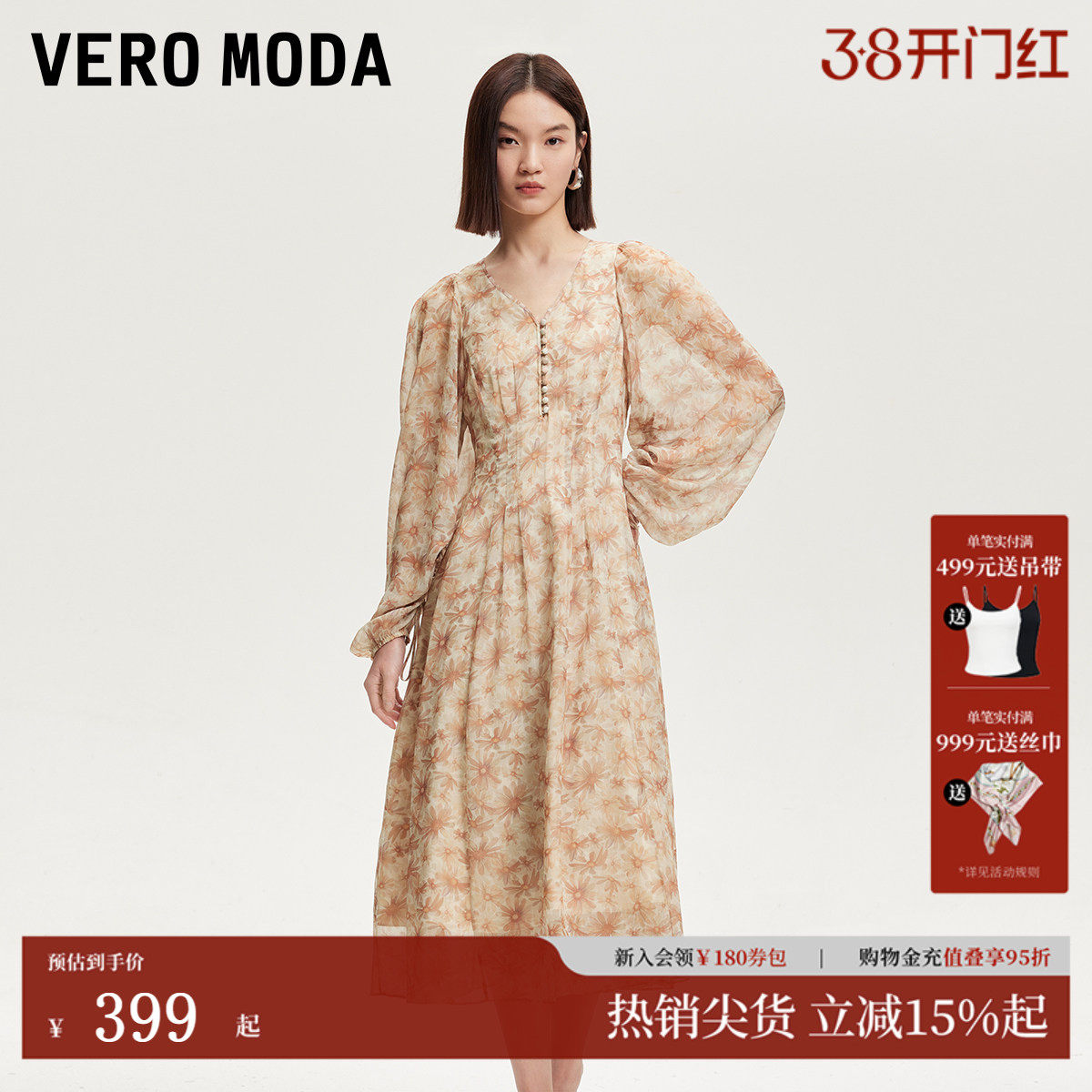 Vero Moda连衣裙2025波西米亚风v领印花抽绳袖口长裙32527D006