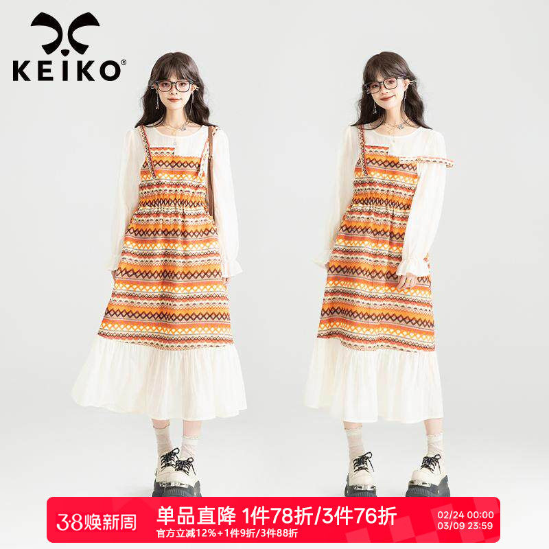 KEIKO 波西米亚风菱格织花连衣裙26春日随性出游假两件式A字长裙