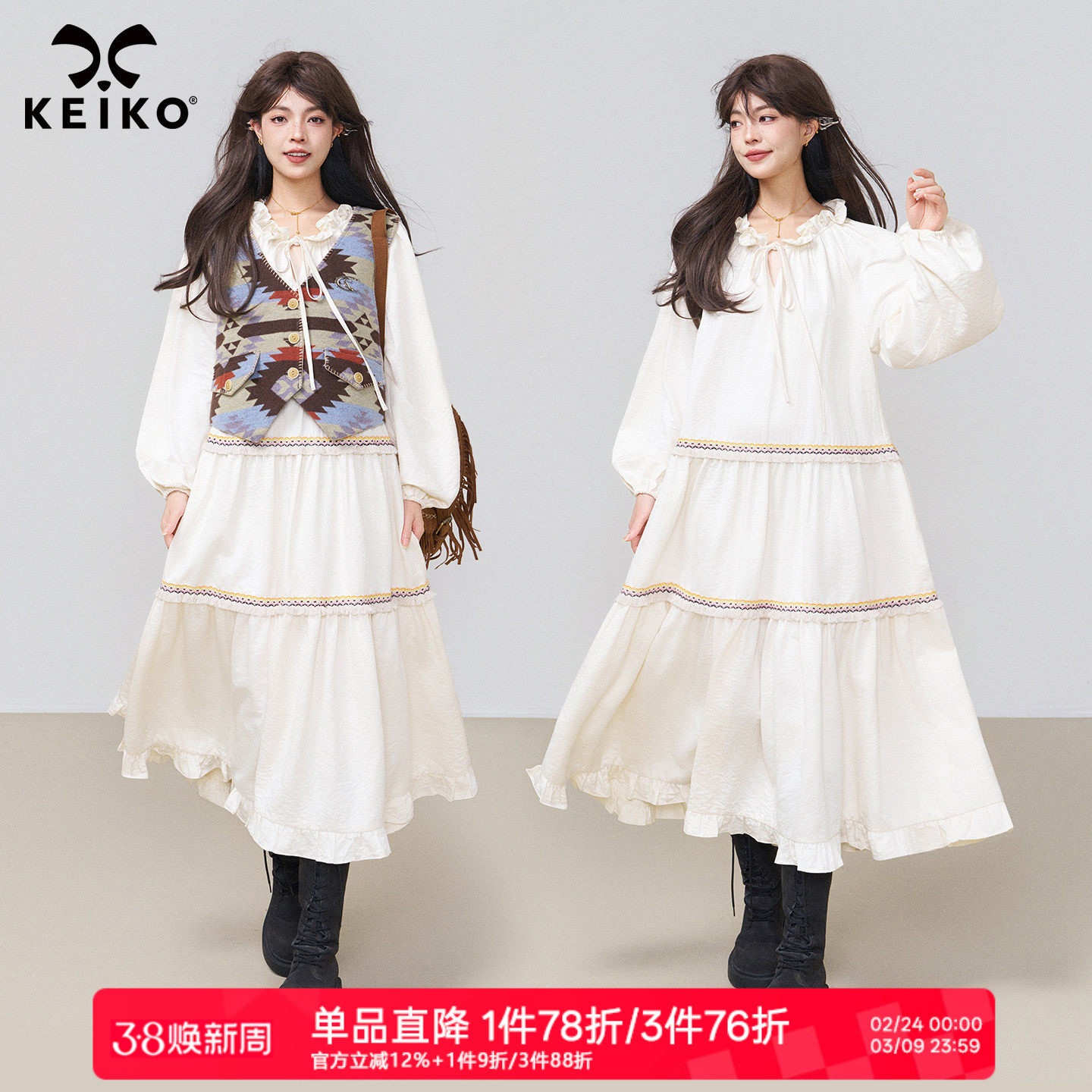 KEIKO 法式提花织带白色连衣裙春季波西米亚风拼接灯笼袖A字长裙