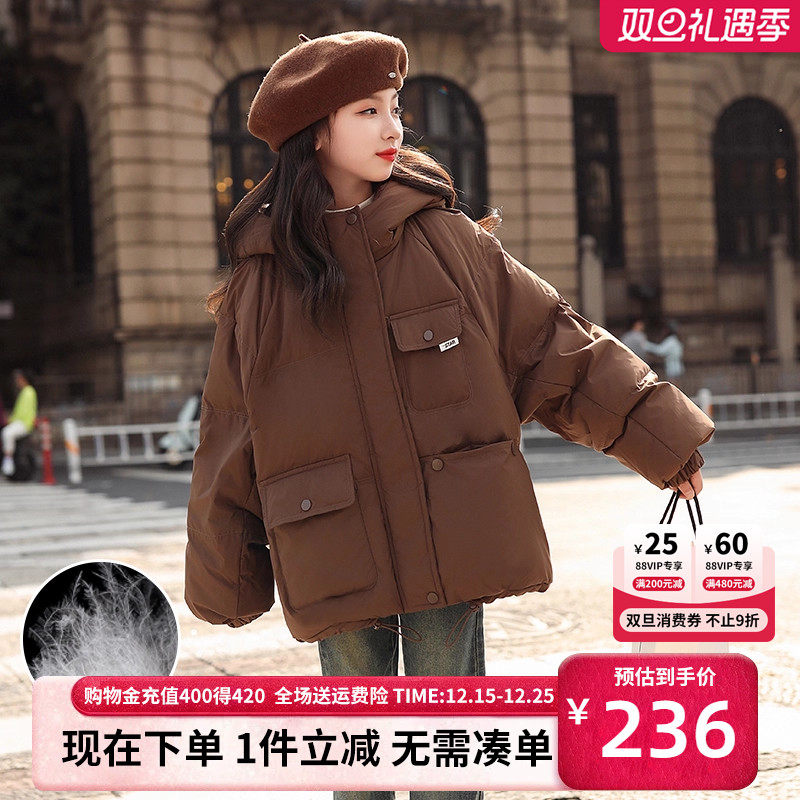 女童连帽羽绒服冬季2025新款90白鸭绒女孩外套儿童加厚保暖面包服