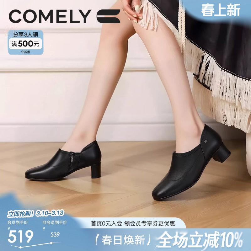 康莉羊皮高跟深口单鞋2025年秋季新款气质百搭方头粗跟皮鞋裸靴