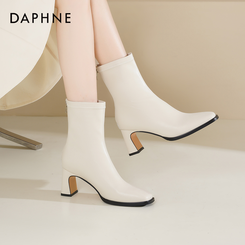 达芙妮高跟短靴女2025新款秋季百搭裸靴法式瘦瘦靴方头白色马丁靴