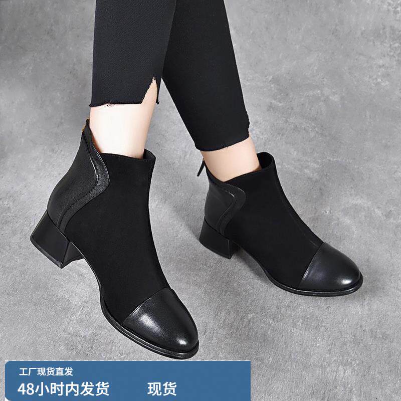 2025秋季新款真皮短靴女磨砂皮高跟粗跟切尔西靴短筒裸靴单靴女鞋