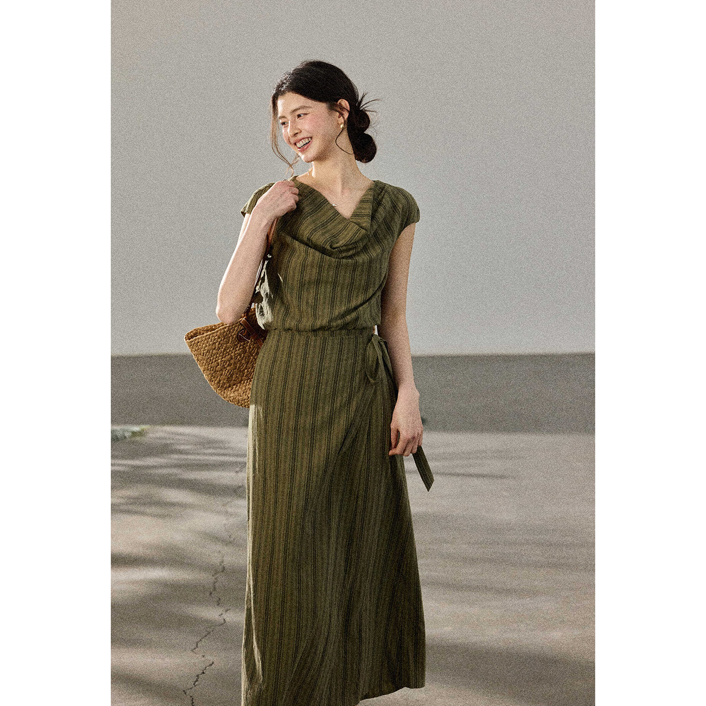 贰羊设计【青木研】通勤气质荡领绑带连衣裙女夏绿色条纹棉麻长裙