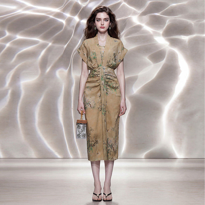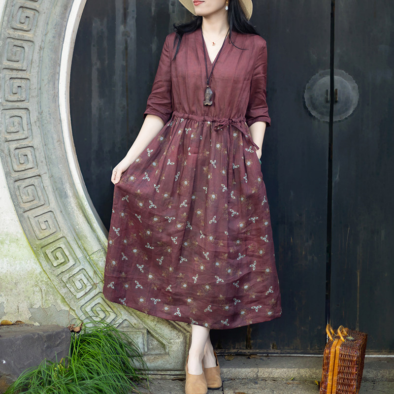 念江南V领收腰中长裙显瘦宽松印花复古女裙苎麻连衣裙女2026新款