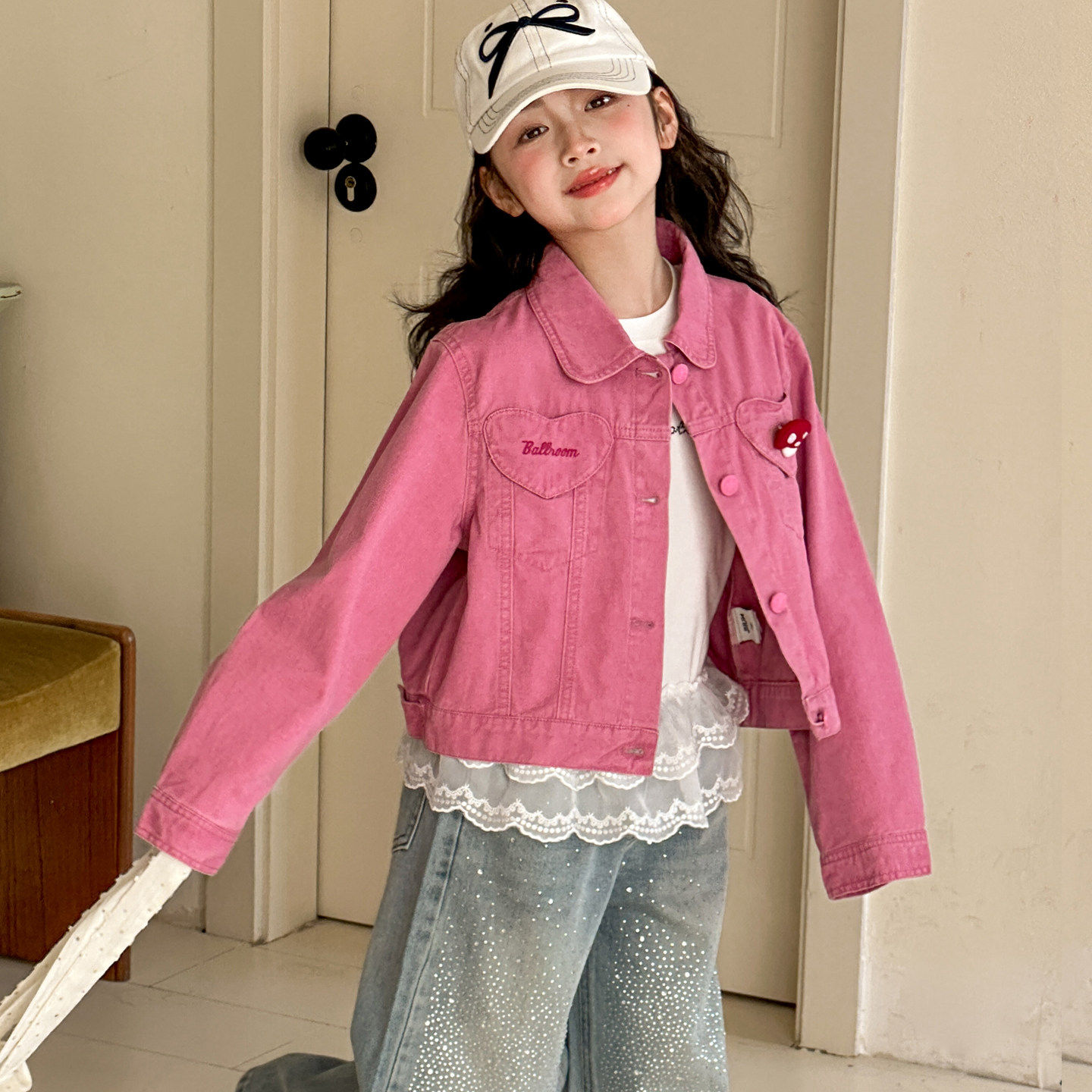 女童牛仔外套春秋2026新款韩国童装女大童粉色短款上衣初中生春装