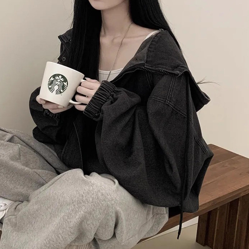 韩国chic秋冬复古帅气拉链宽松休闲百搭大口袋长袖连帽牛仔外套女
