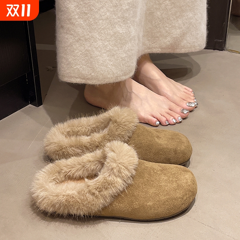 2025秋冬外穿丑萌大头女复古包头棉毛毛半拖鞋加绒保暖一脚蹬懒人