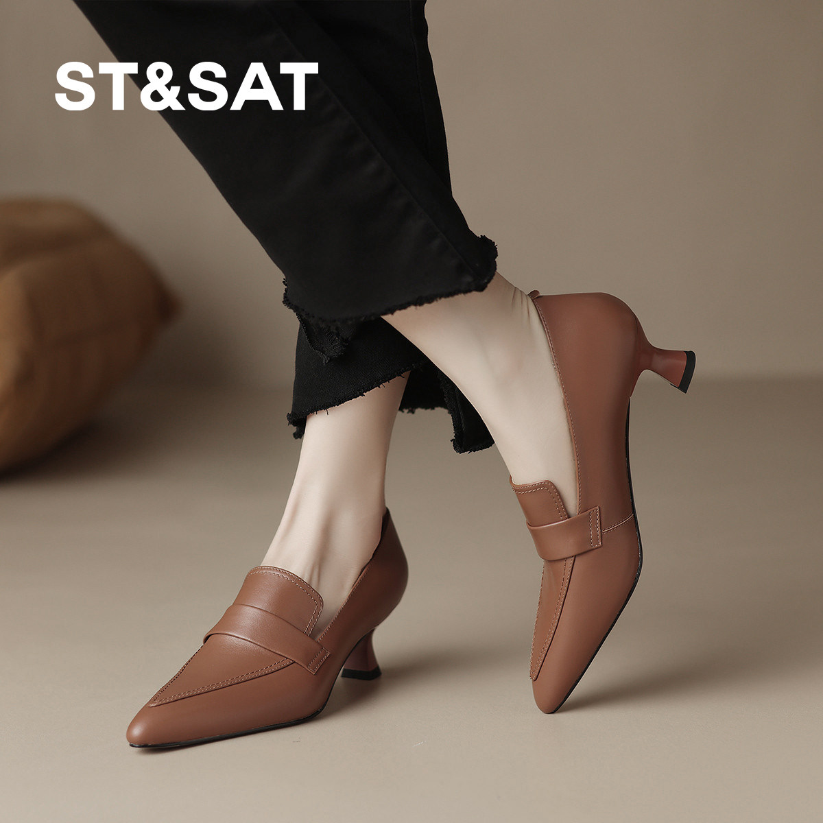 星期六2026新款5cm小跟单鞋女尖头T字带时尚细跟包头配裙子高跟鞋