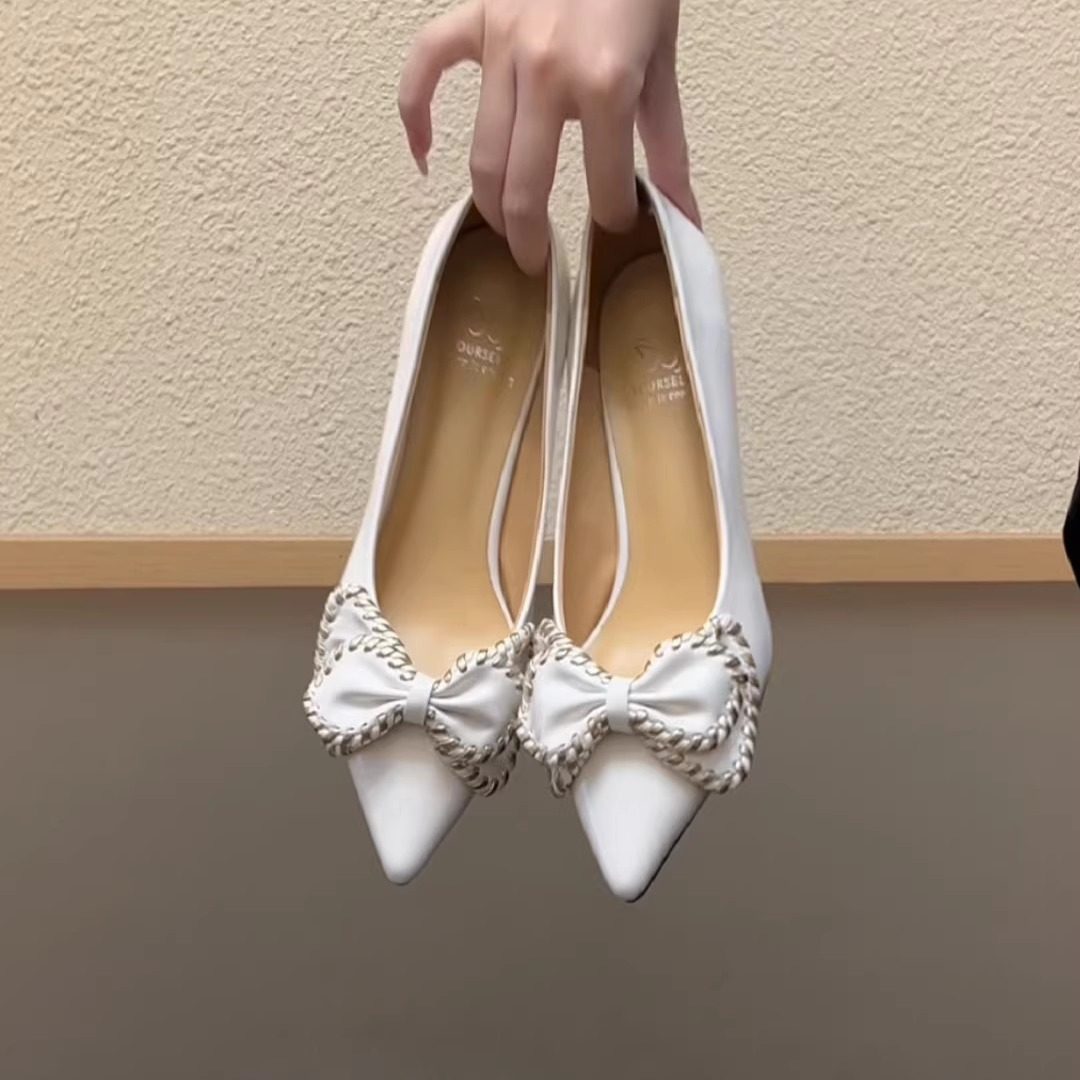 RubyL/5cm法式优雅尖头浅口单鞋蝴蝶结牛皮细跟高跟鞋气质不累脚