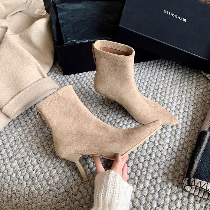 尖头细跟短靴女2025新款秋冬5cm低跟瘦瘦靴法式显瘦绒面高跟靴子
