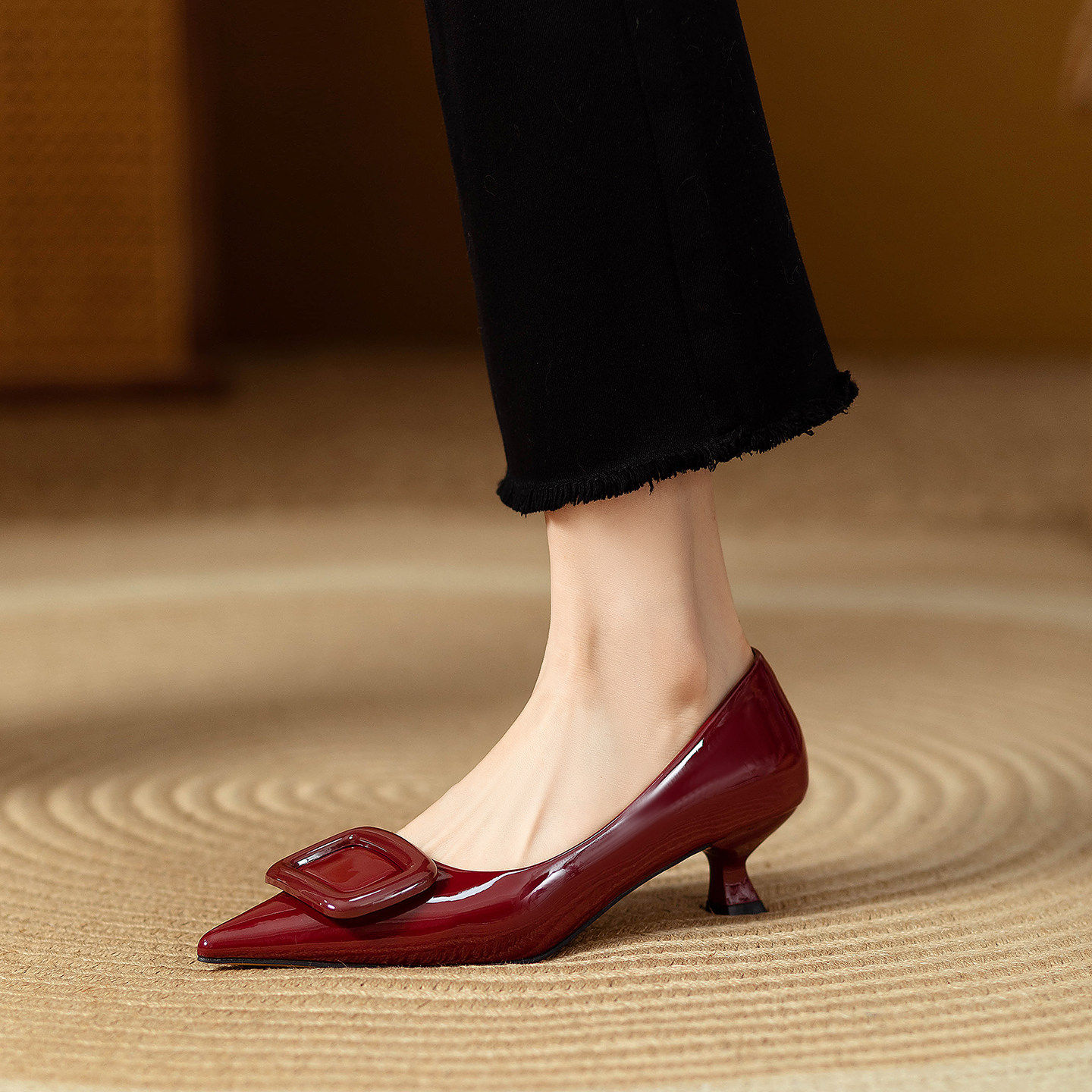 法式漆皮猫跟单鞋方扣浅口鞋气质尖头高跟鞋女新款5cm细跟酒红色