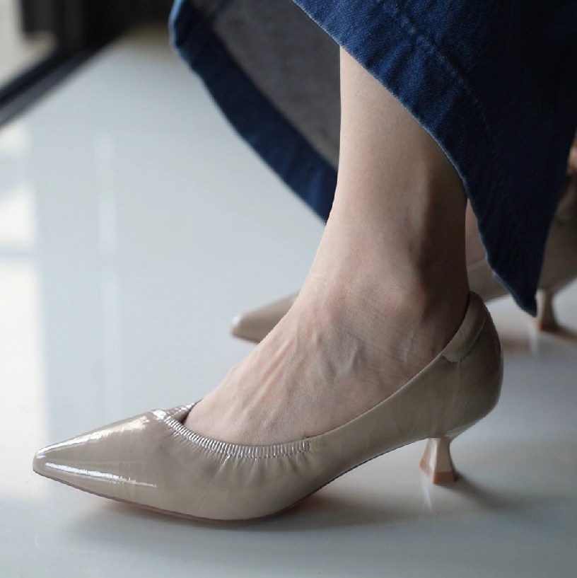 壹家shoes019020牛皱漆皮5cm尖头单鞋女2025新款细跟浅口高跟鞋