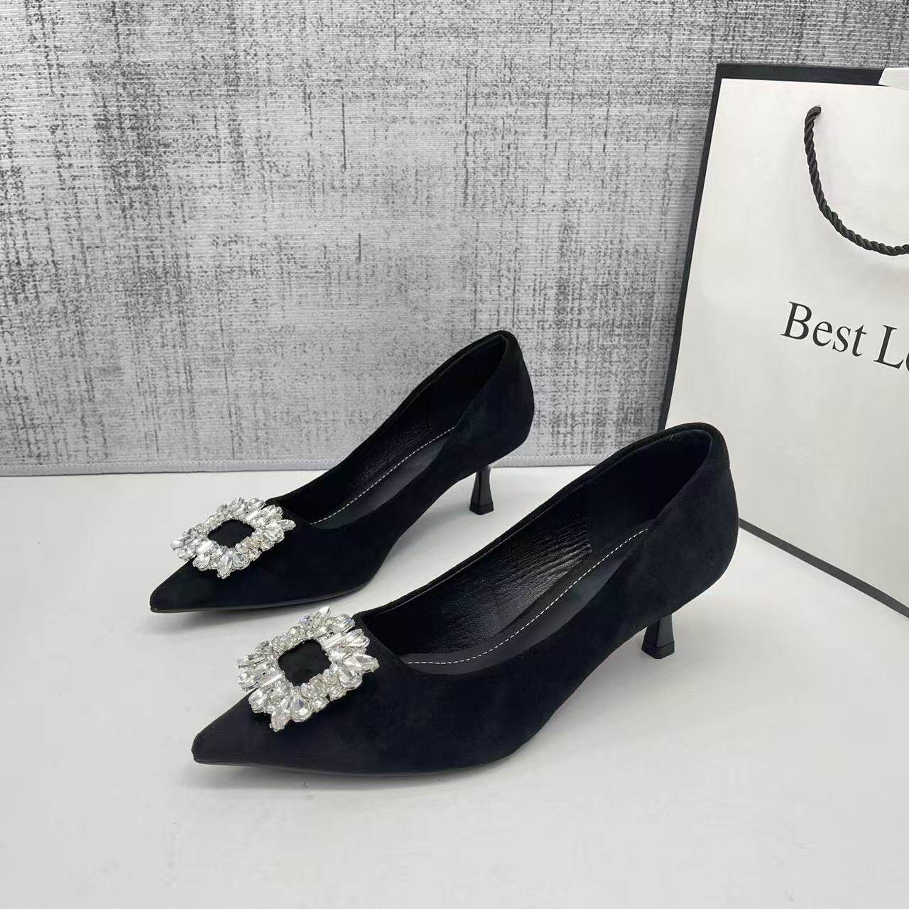 5cm绒面职业高跟鞋女细跟水钻方扣工作通勤不累脚浅口尖头单鞋