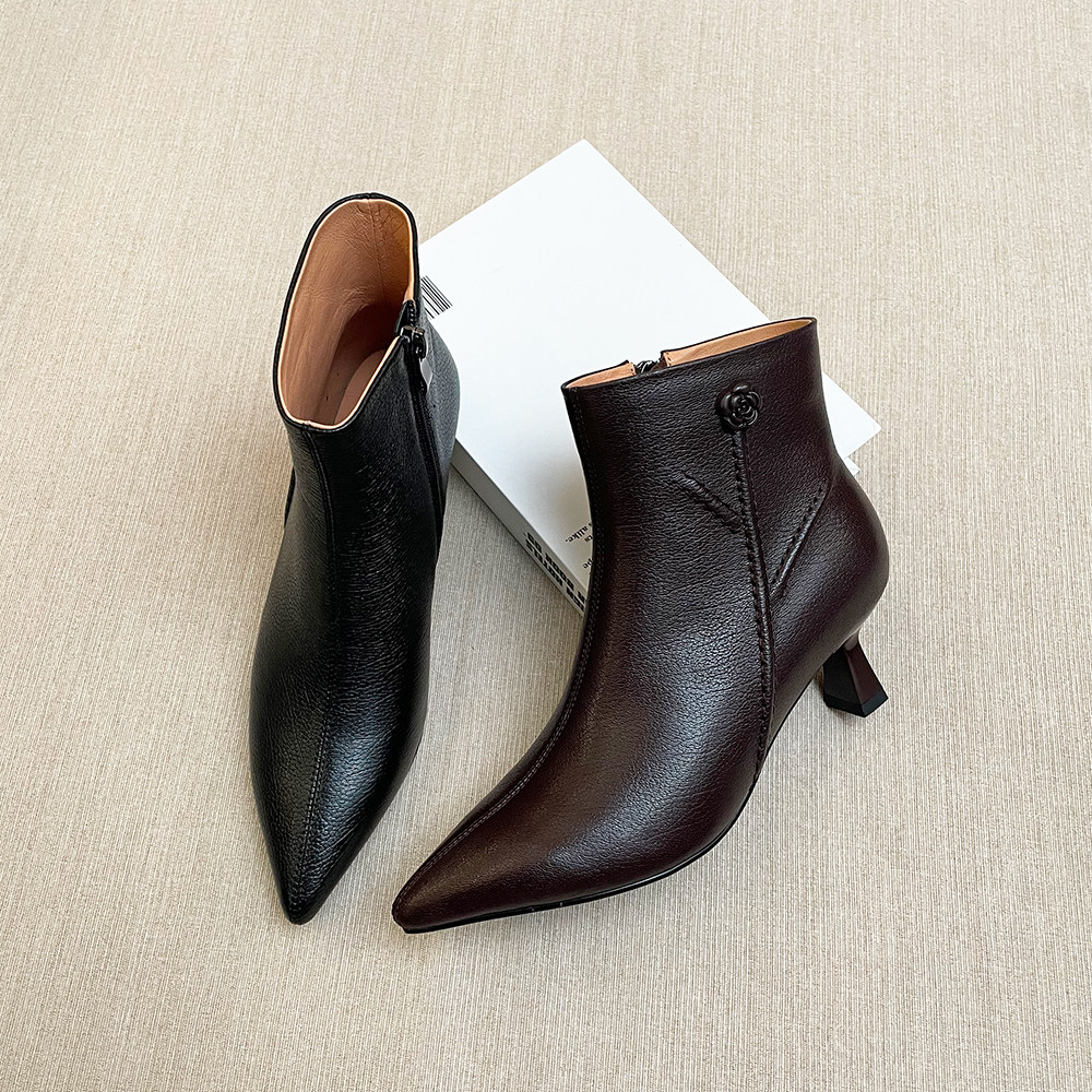 羊皮跟高5CM秋冬季气质尖头法式百搭侧拉链细跟高跟鞋真皮短靴