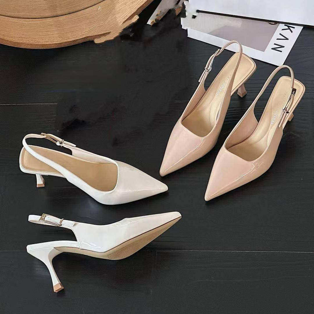 5cm裸色高跟鞋春夏季细跟2026新款漆皮尖头一字带后空包头凉鞋女