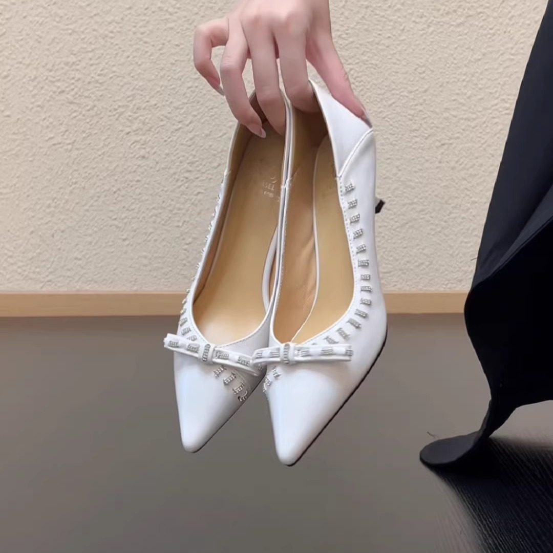 RubyL/5cm法式优雅尖头浅口单鞋女水钻蝴蝶结细跟牛皮高跟鞋绝美