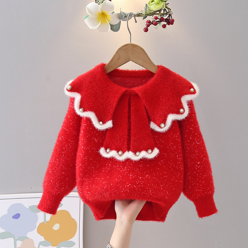 女童秋冬季毛衣2025新款水貂绒洋气娃娃领中大童针织衫儿童打底衫