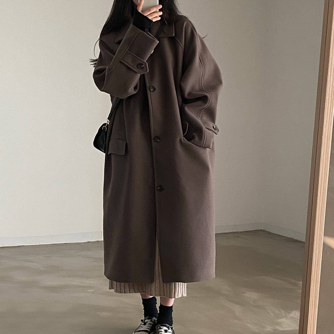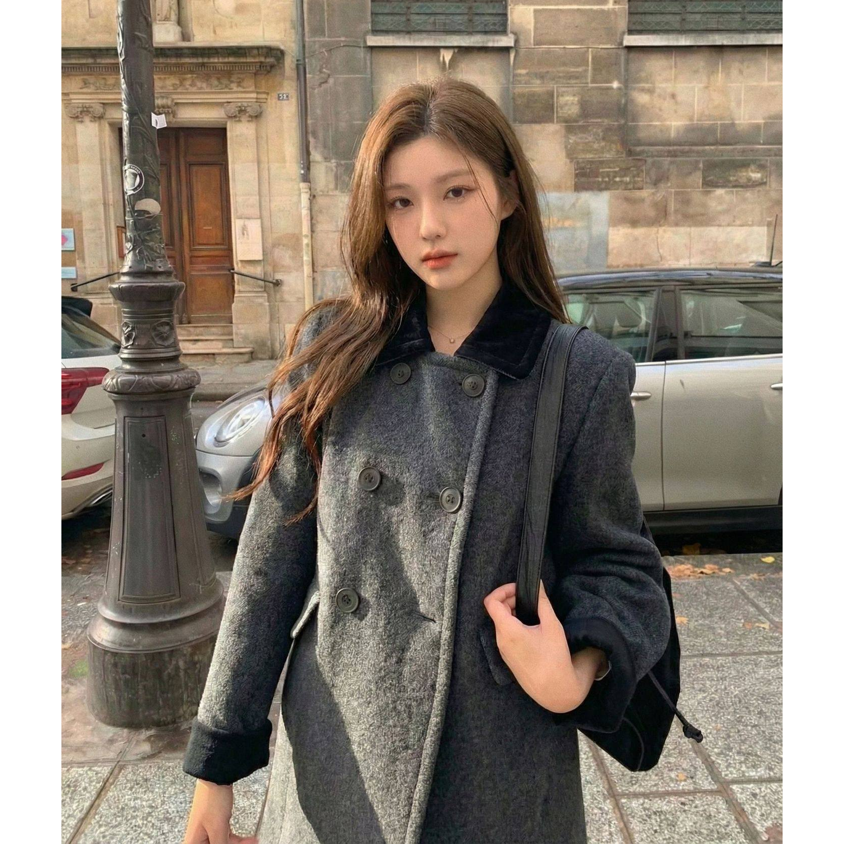 韩国chic秋冬复古高级感翻领双排扣宽松中长款长袖呢子外套大衣女