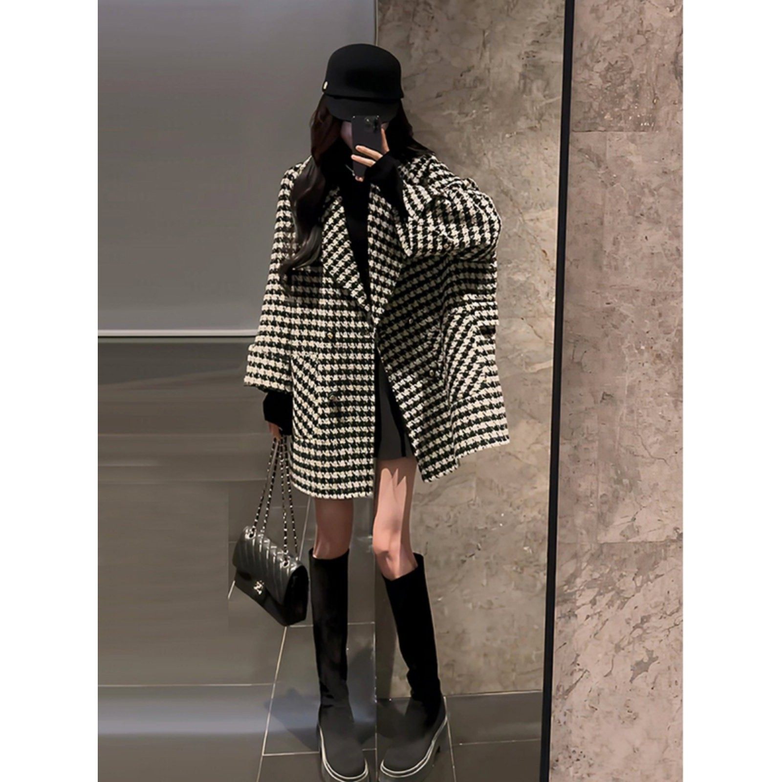 韩国2025冬新款小香风宽松中长款毛呢外套女千鸟格呢子宽松大衣潮