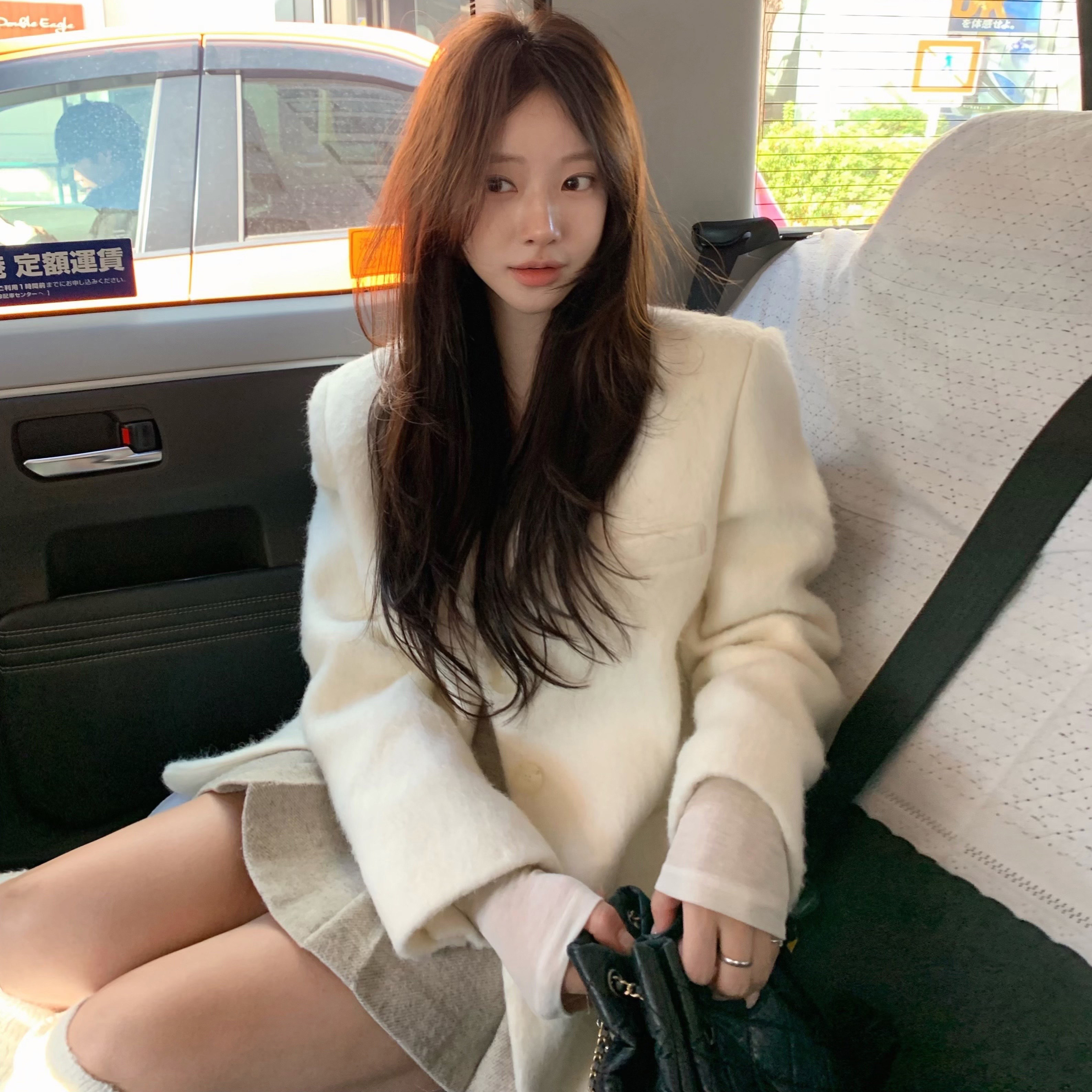 韩国东大门白色羊毛呢西装外套女中长款宽松显瘦加厚保暖呢子大衣