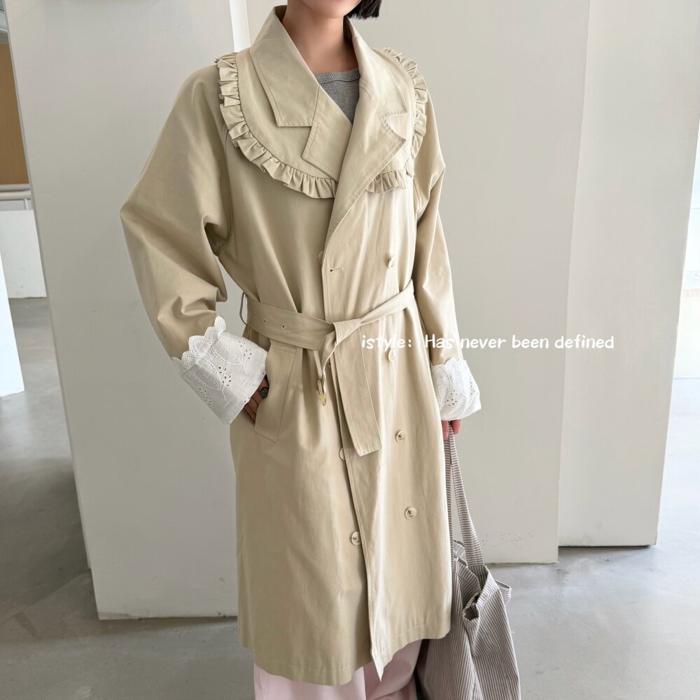 istyle英伦大翻领风衣女中长款收腰系带宽松外套小个子卡其色大衣
