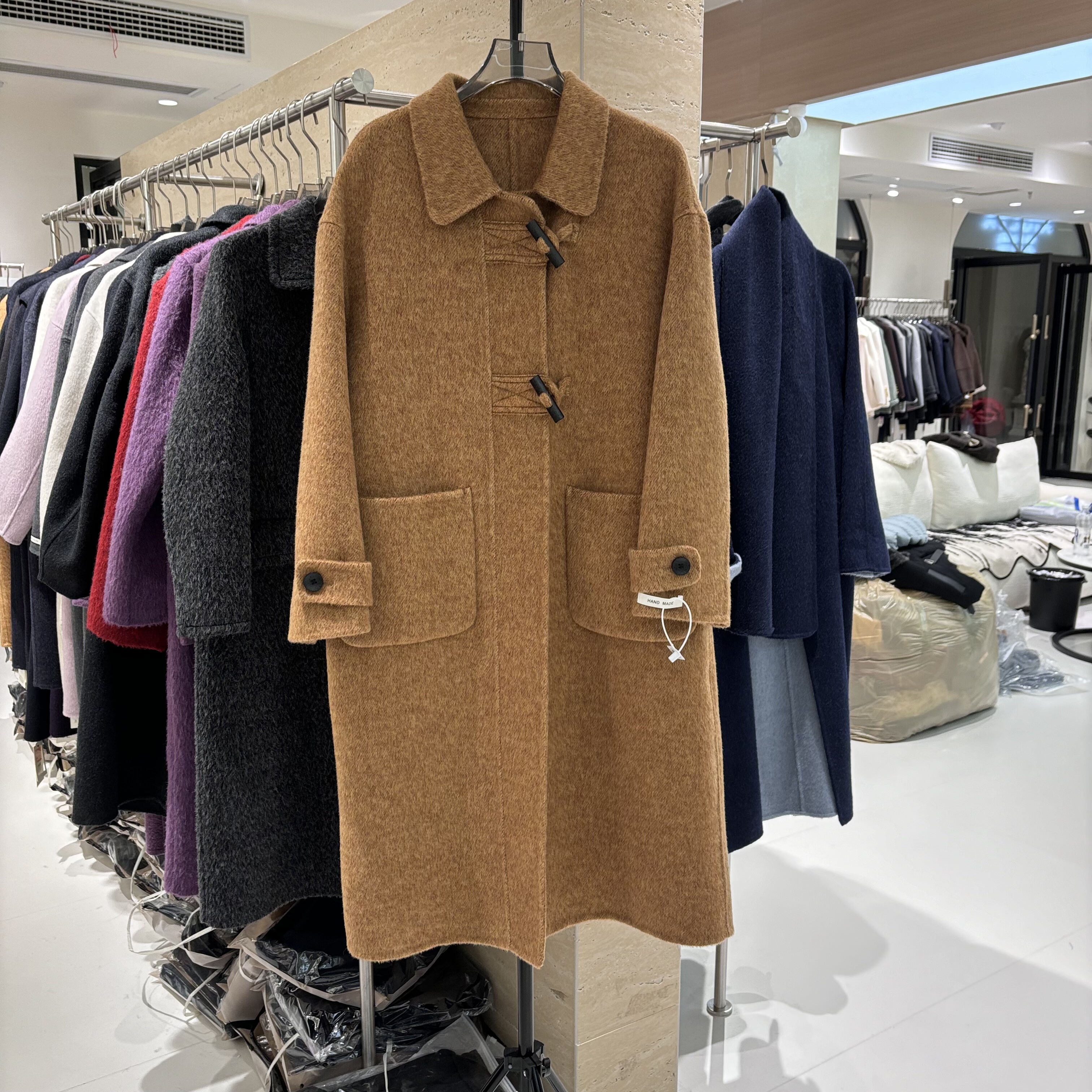 韩国2025年新款长毛牛角扣双面羊毛大衣女中长款宽松连帽呢子外套