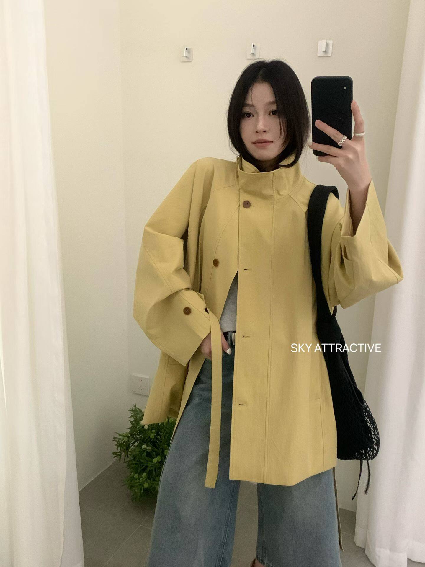 sky98835韩系2026春新款立领风衣女设计感小众中长款大衣宽松外套