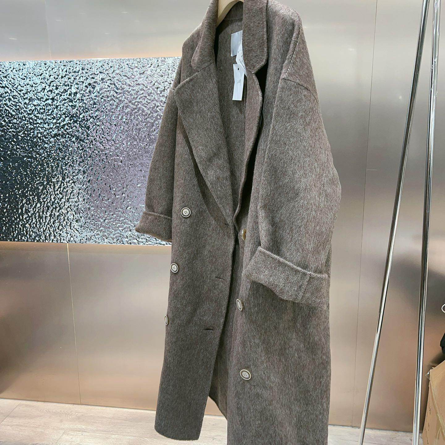 韩国女装2025早春新品 考拉绒宽松中长款翻领双排扣羊绒大衣外套