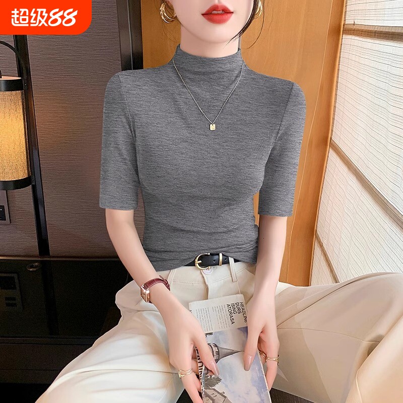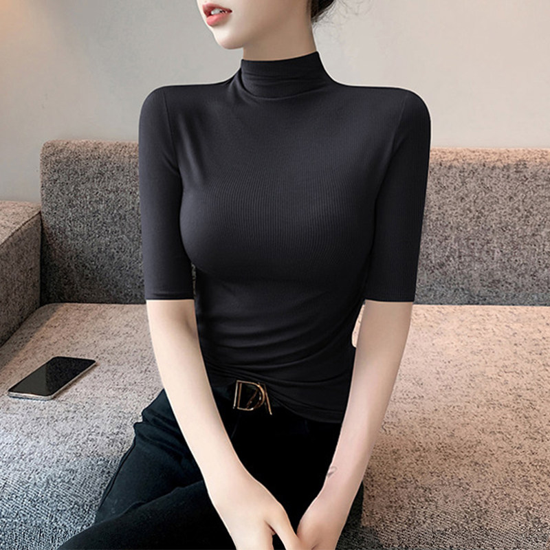 黑色莫代尔半高领中袖打底衫女新款紧身显瘦上衣白色螺纹气质轻薄