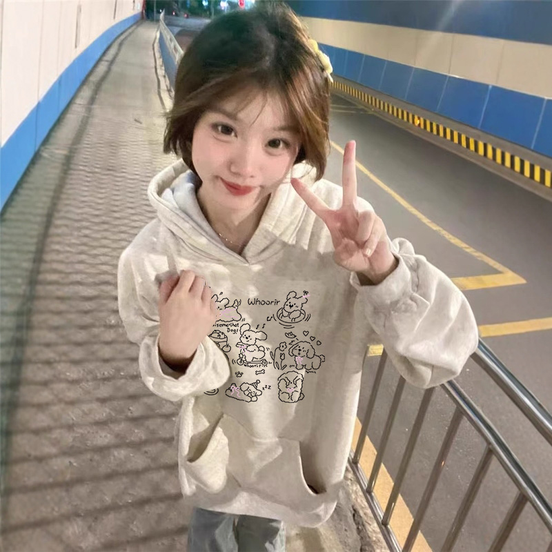 hiphop学院风潮牌女装卫衣初冬加绒灰色外套ins百搭美式卡通上衣