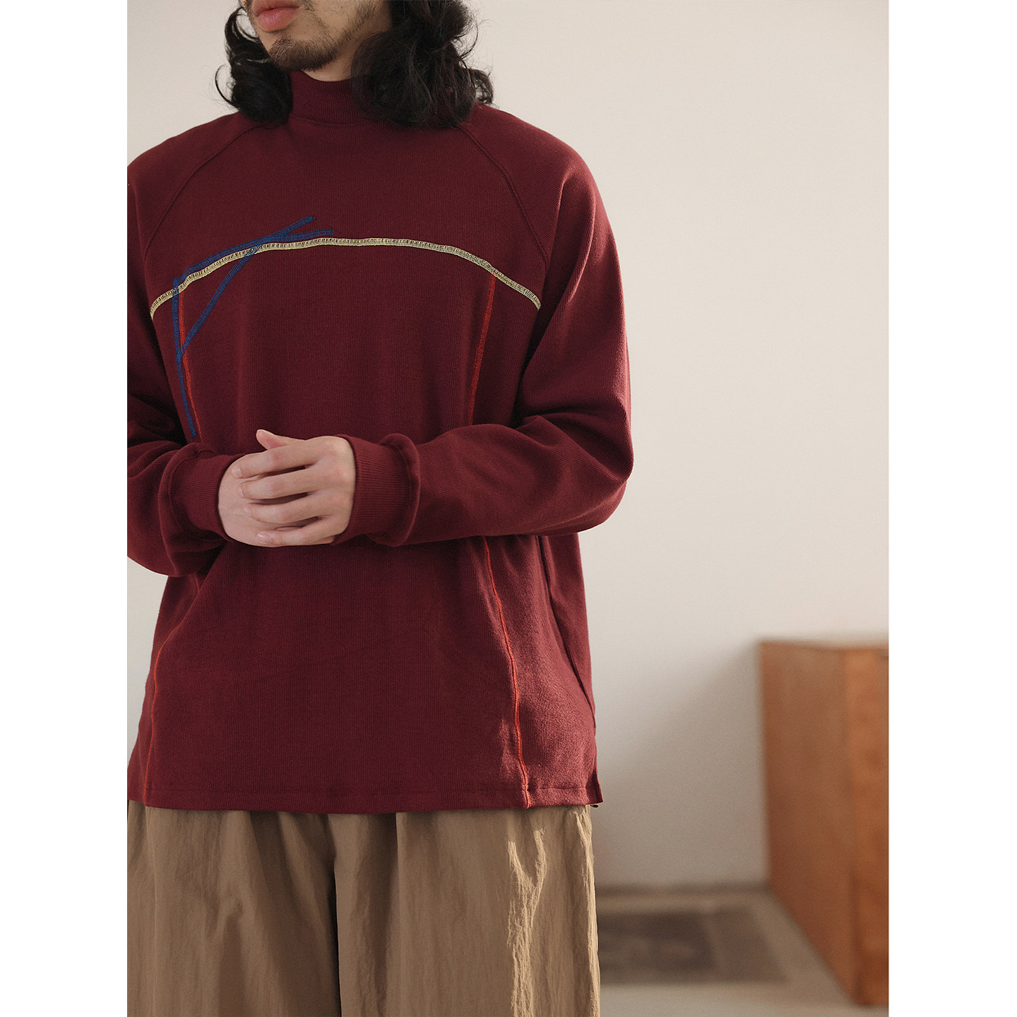 NOEARS冬季复古风半高领设计针织螺纹打底衫红色宽松长袖撞色T