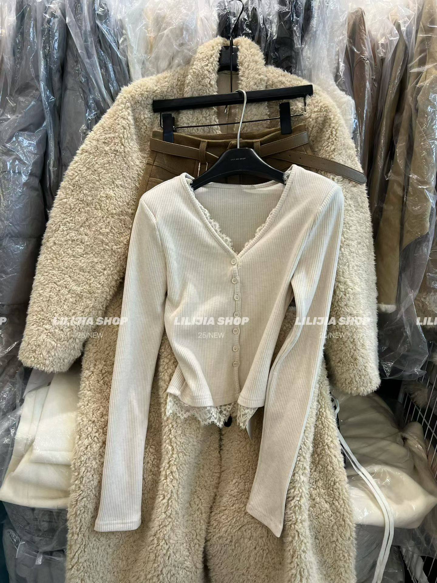 Miss家 2025秋冬新款韩版时尚百搭宽松显瘦蕾丝拼接螺纹打底衫