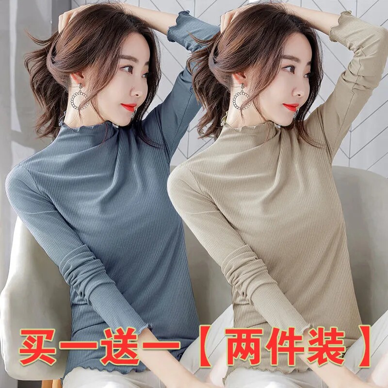 单/两件装螺纹打底衫女春秋木耳边半高领修身长袖t恤女百搭上衣服