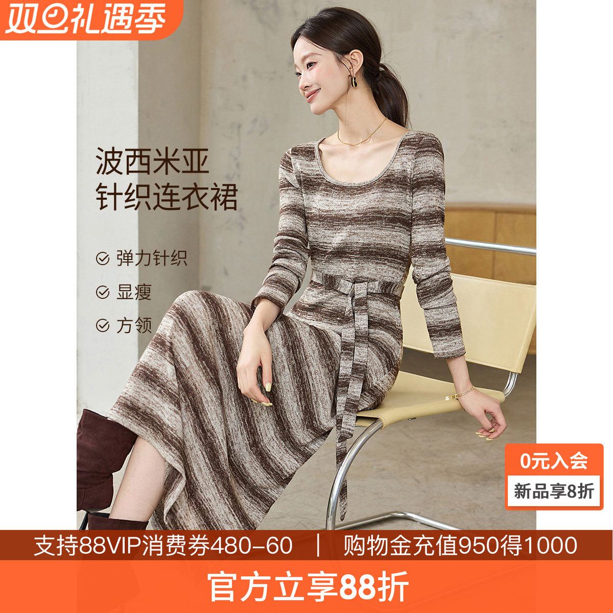 沫晗依美新派波西米亚风裙子2025秋季复古撞色渐变条纹针织连衣裙