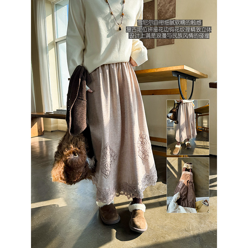 雪尼尔定位拼接钩花花边波西米亚度假风松紧腰显瘦半身裙安妮森林