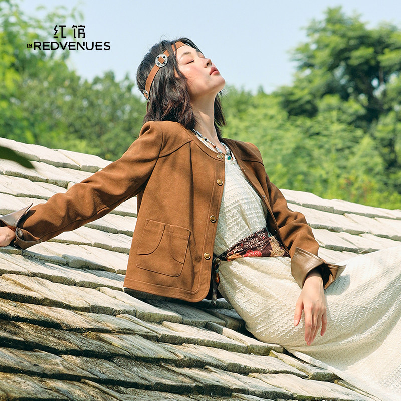 红馆2025秋季新款麂皮圆领薄外套女巨好看轻熟女士外套短款小上衣