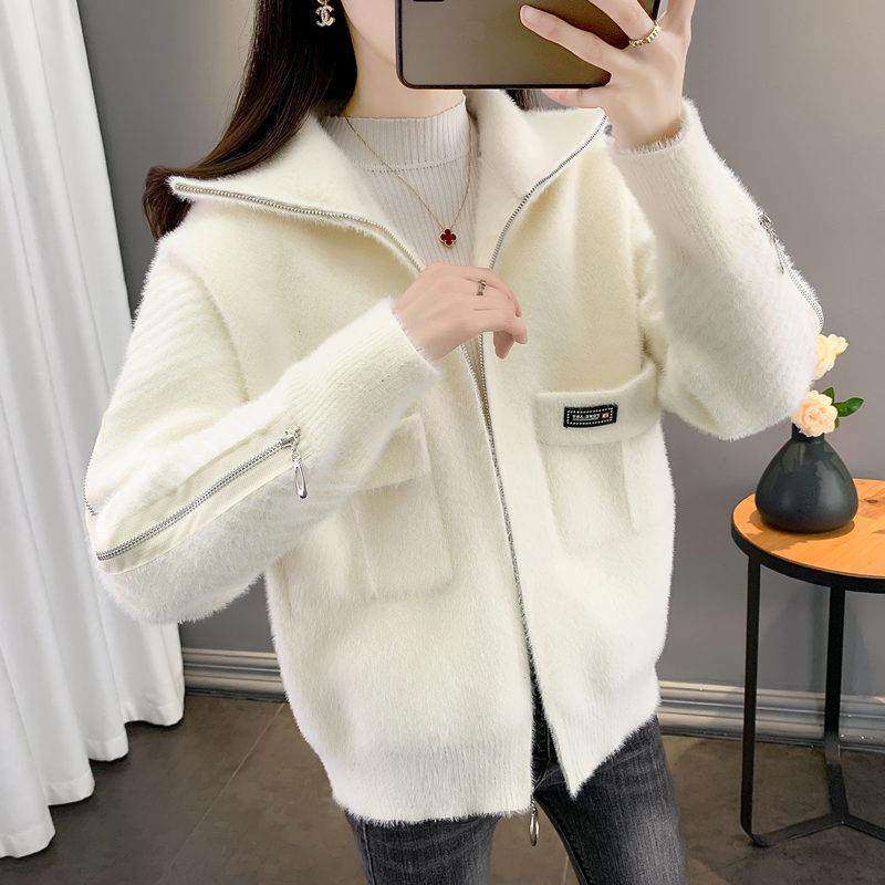 春秋季女士外套短款水貂绒2025新款百搭拉链宽松针织开衫加厚上衣
