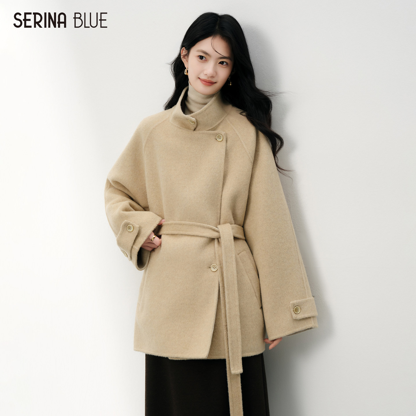 SeRinaBlue2025冬季新款立领收腰女士外套短款毛呢羊毛大衣双面呢