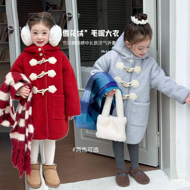 冬加绒加厚女童韩版洋气英伦风气质学生中长款连帽毛呢大衣外套潮